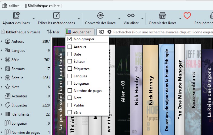 Une fois la vue activée, vous pouvez regrouper vos livres selon différents critères : auteur, série, ou d’autres critères.