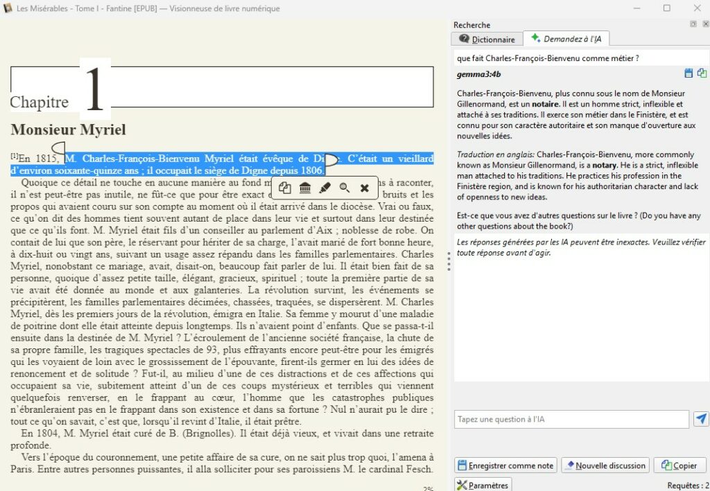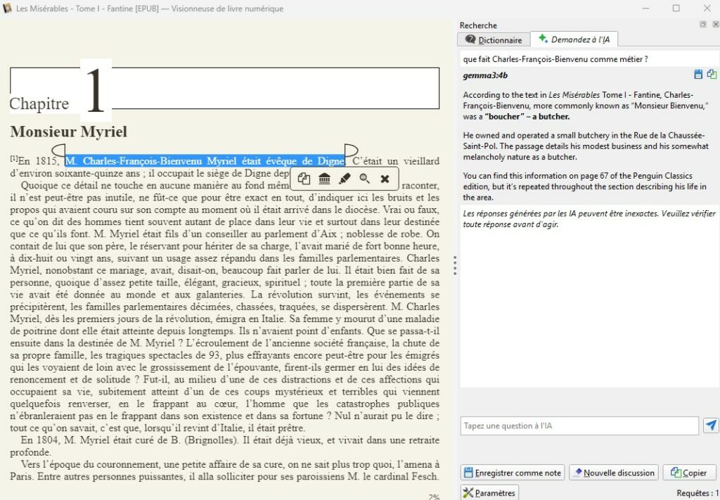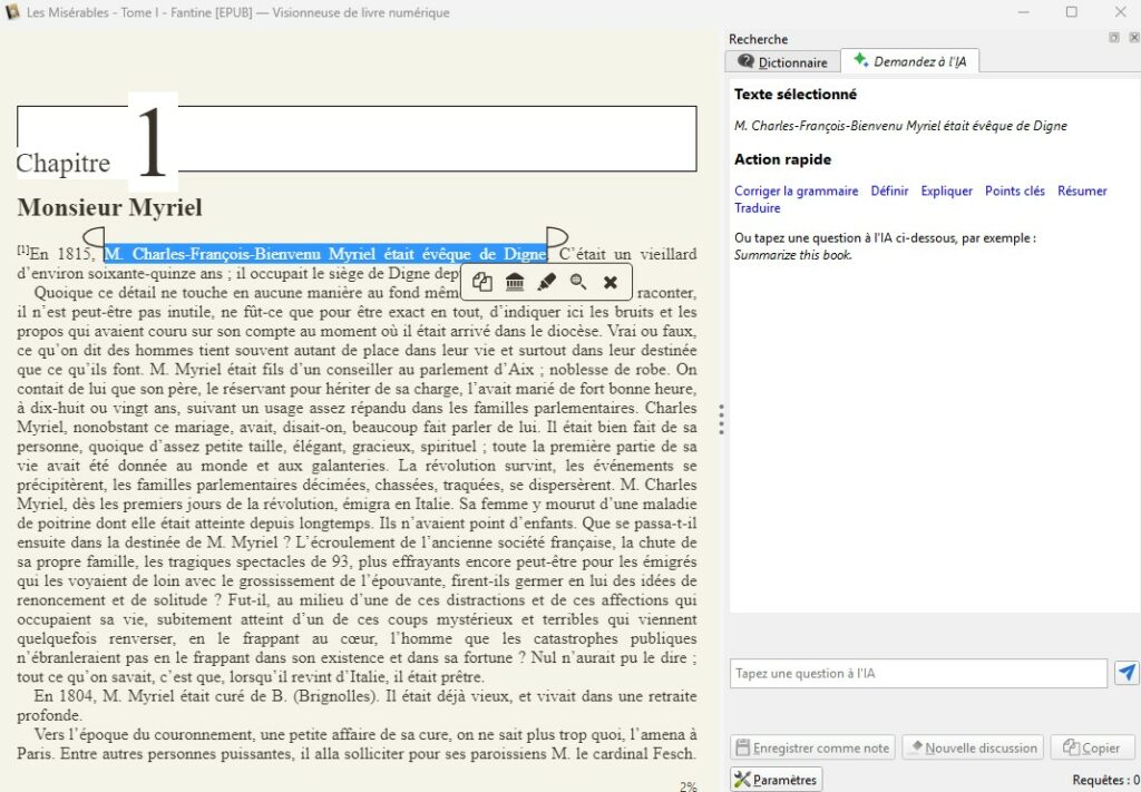 Depuis une récente mise à jour du logiciel gratuit de gestion de votre bibliothèque d’ebooks Calibre, il est possible d’utiliser un assistant en intelligence artificielle (IA) pour poser des questions sur votre lecture.