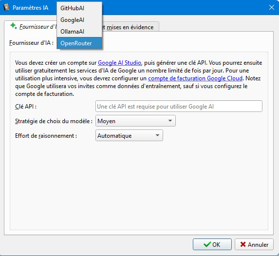 Vous avec donc différentes options en ce qui concerne le « Fournisseur d’IA ». Voici la liste et les liens qui vous permettront d’obtenir une clé API.