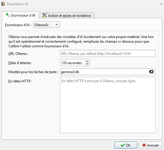 Il faut aller configurer Calibre avec les informations concernant votre installation de Ollama en indiquant le modèle « gemma3:4b » (ou un autre que vous voulez utiliser) :