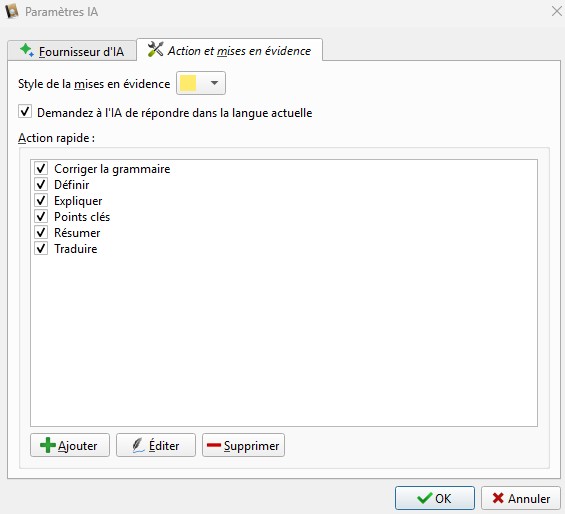 Commençons par l’option la plus efficace et rapide : utiliser un service d’IA existant. En cliquant sur le bouton « Paramètres » placé en bas de la fenêtre, vous accéder à l’outil de configuration (voir la capture d’écran ci-dessous) :