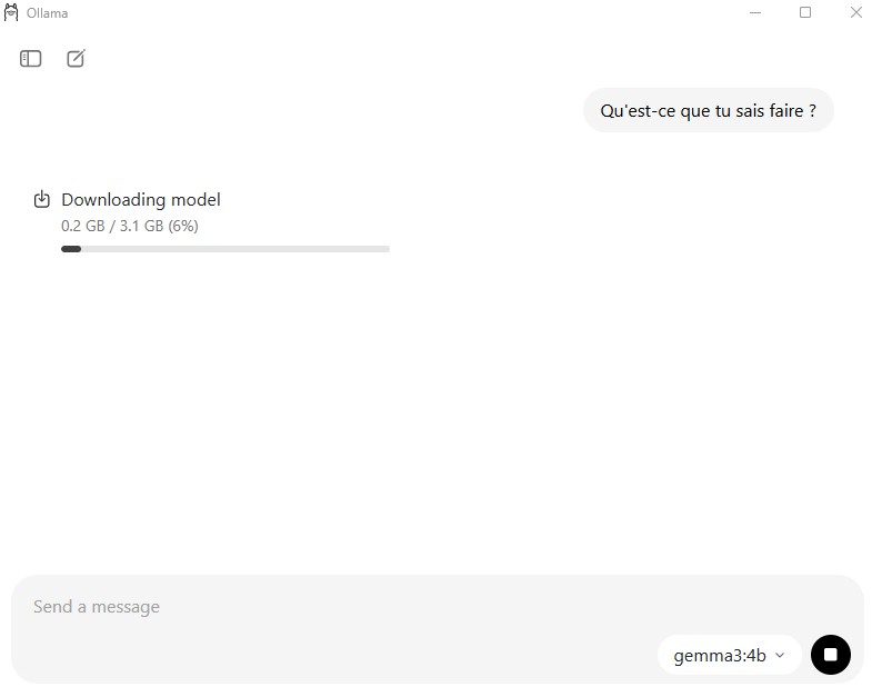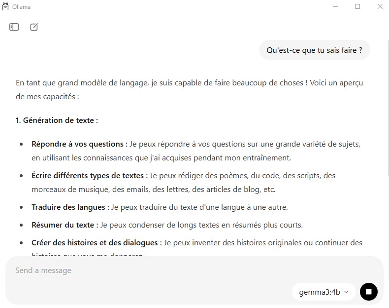 L’interface est assez simple à comprendre puisqu’il suffit de laisser une question et de valider pour obtenir une réponse. Sauf que lors de votre première utilisation, vous aurez à choisir un modèle IA. Par défaut, c’est « gemma3:4b » qui est sélectionné par défaut.