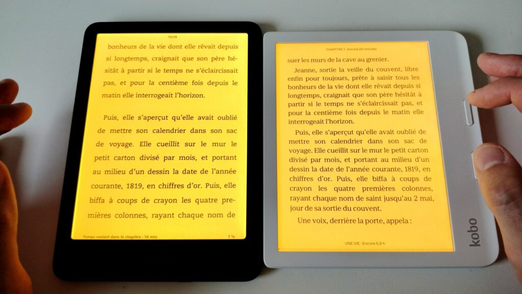 - Éclairage : la Kindle gère mieux la lumière frontale, mais dès qu’on active le filtre de lumière bleue, les différences s’atténuent,