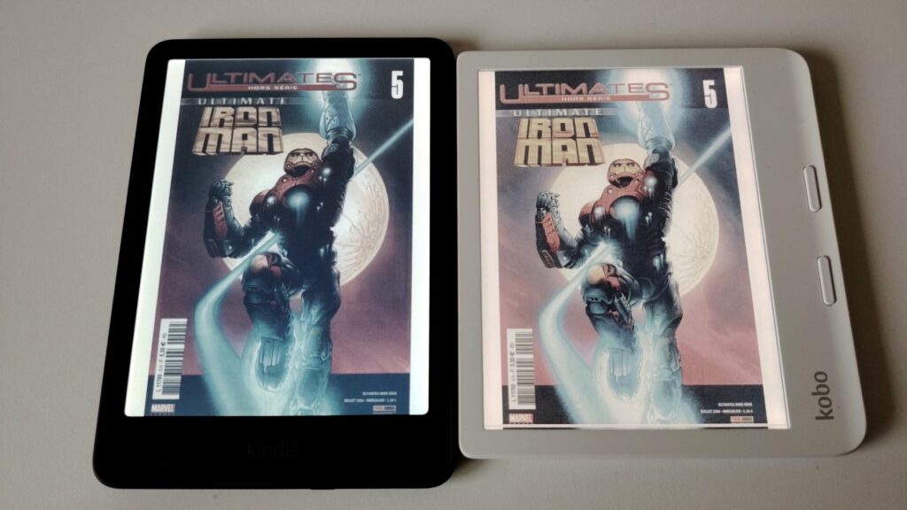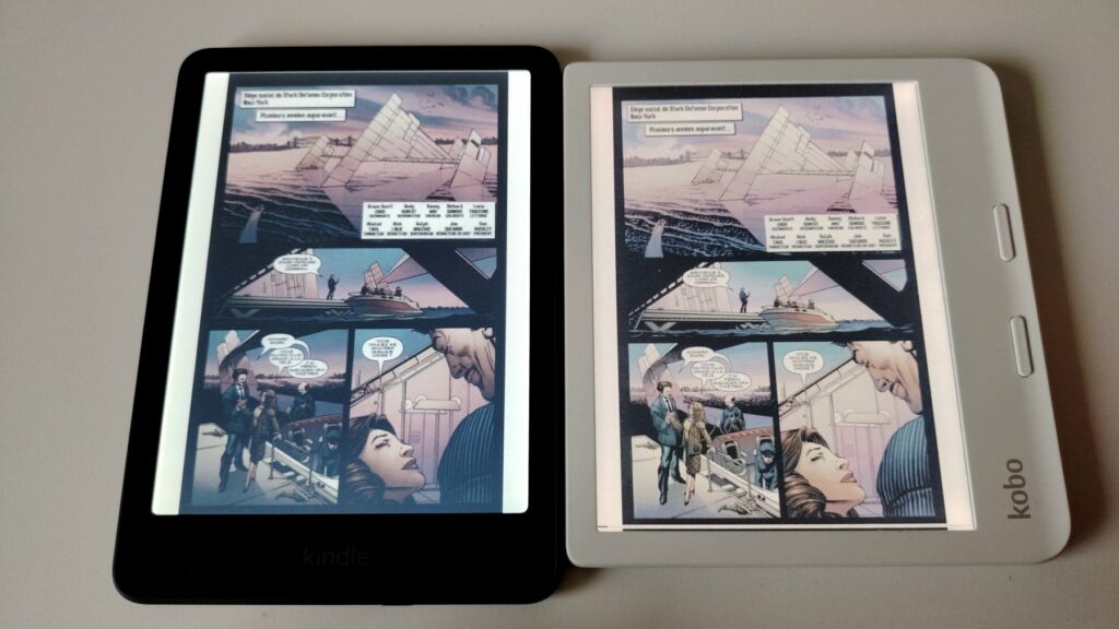Je trouve que les deux liseuses affichent très bien les pages mais avec un contraste différent. Si vous préférez une page de texte plus « blanche », la Kindle Colorsoft est donc à préférer.