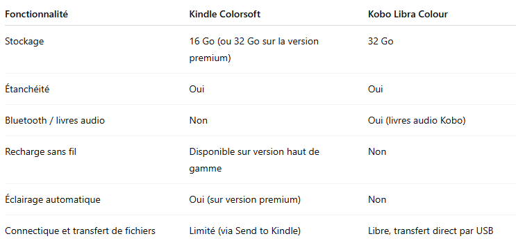 Au niveau des fonctionnalités, la Kobo Libra Colour permet d’écouter des livres audios ce que la Kindle Colorsoft ne permet pas. Néanmoins, seuls les livres audios de la librairie Kobo sont compatible avec la Libra Colour.