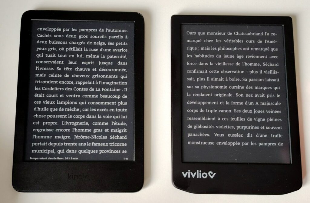 Cependant, la Kindle cache un écran haute définition, ce qui n’est pas le cas de la liseuse Vivlio. En pratique, lorsque l’on met les deux écrans côte à côte, on voit nettement la différence avec une meilleure restitution, « plus fine », des caractères sur l’écran de la Kindle.