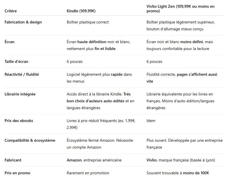 Différences et similitudes entre la Kindle et la Vivlio Light Zen