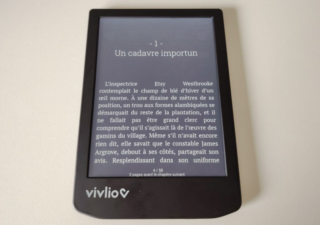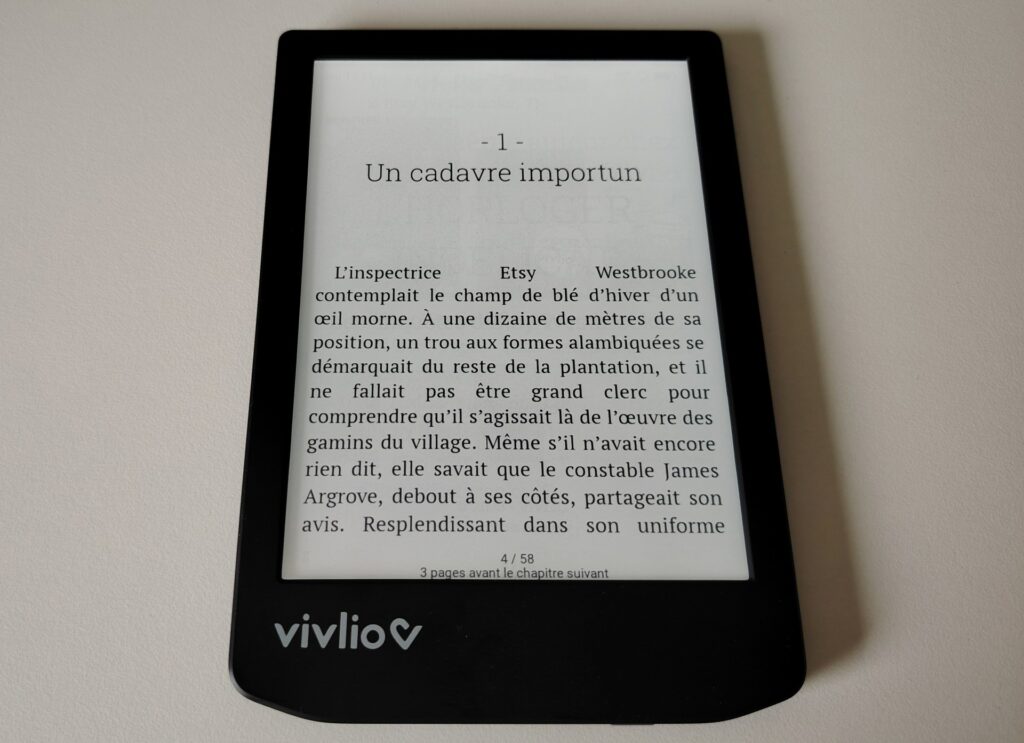 Lorsqu’on allume la liseuse, on a bien l’éclairage qui se met en route et on observe une bonne définition malgré les 212 PPI de l’écran 6 pouces à encre électronique. A l’usage on a surtout l’impression d’être sur la liseuse Vivlio Light, pourtant plus chère, ce qui est un très bon point.
