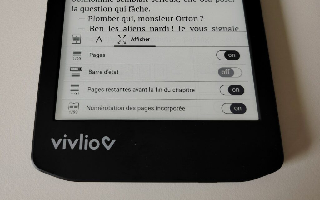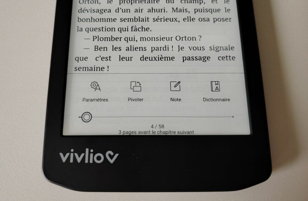 Quelques statistiques de lecture sont disponibles, mais ici les options sont plus limitées que chez Kobo. C’est le cas sur toutes les liseuses Vivlio d’ailleurs. Vous ne saurez donc pas combien de temps de lecture il vous reste dans un chapitre (mais vous aurez le nombre de pages restantes). A l’usage, ce n’est pas forcément gênant je trouve.